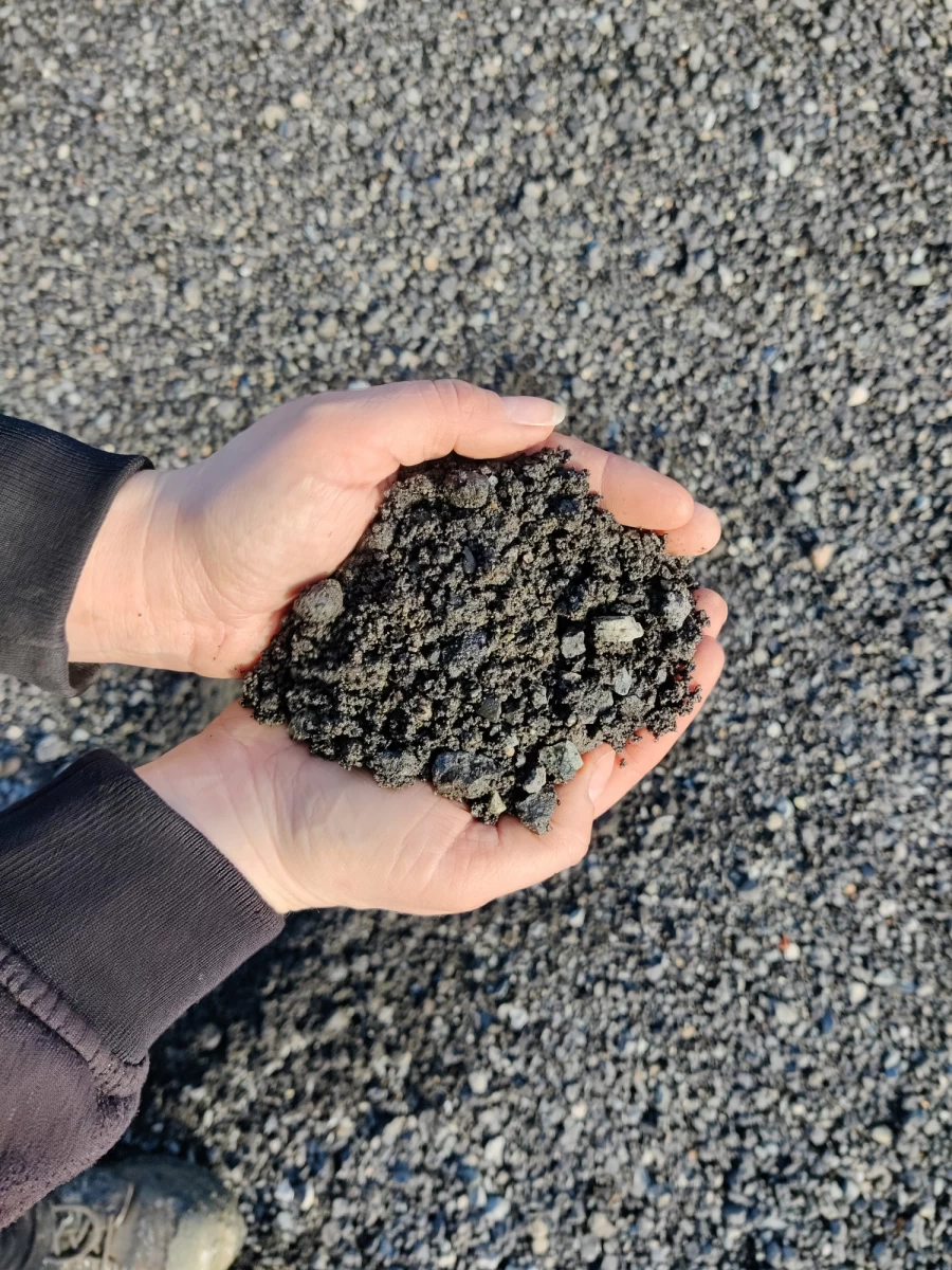 As it sounds – ground up asphalt that is screened to 3/4″ minus material. Should be placed at about 3″ depth on a prepared sub-base of 3/4″ road base. This can then provide an excellent gravel roadway material, say, for a long gravel driveway installation. Best placed, smoothed out, and then compacted. R.A.P. will initially seem “a little soft” but once it is weathered – rained on and the sun bakes it – this gravel will harden up and create a great, durable surface. NOT an asphalt replacement, however, this gravel does have the unique benefit of VERY minimal dust due to the bit of residual oil in the gravel mixture that “locks up” the fines and prevents them from blowing around.