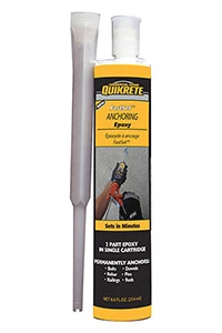 QUIKRETE® FastSetTM Anchoring Epoxy is a gray solvent-free, low odor, high strength, moisture insensitive, non-sag epoxy suitable for vertical or horizontal applications, including anchoring bolts, threaded rods and rebar dowels, pins and railings, into concrete and masonry substrates. Suitable for fastening in grout filled block and unreinforced masonry, and seismic anchoring and bracing.