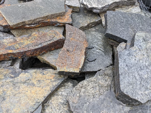 This gorgeous quartzite is mainly grey and tan with mica, showing silver streaks and highlights. An excellent product for unique patios and rock accents showing a bit of sparkle in the sun.