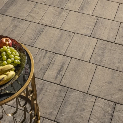 Coastal Slate Concrete Paving stone has the texture of natural Sandstone and is intended to be installed in a truly random pattern. Three sizes of paver are combined on each layer of the pallet, with every stone having a different slate texture.