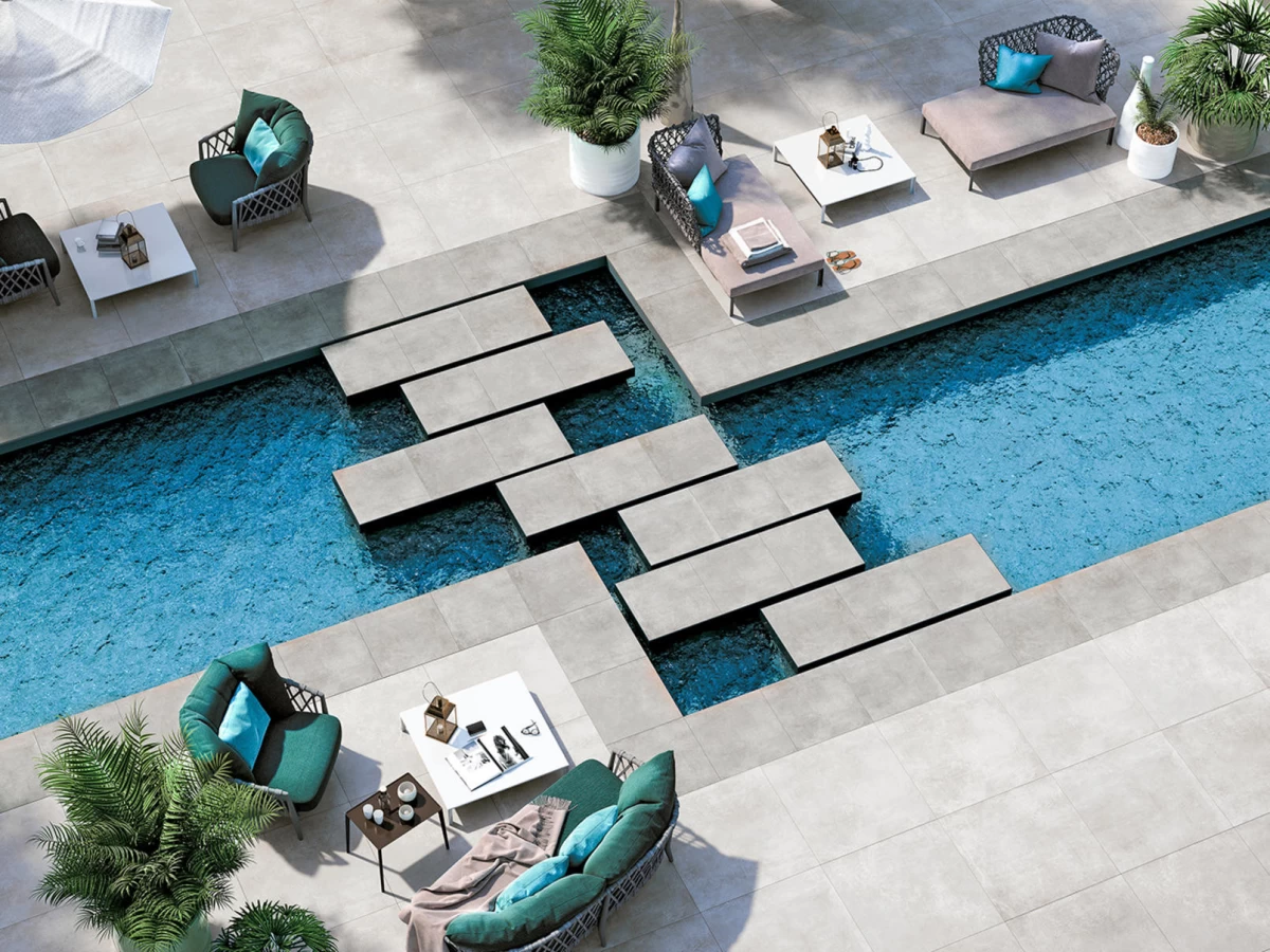 Two installation needs, a single solution. UNICO, size 12.99" x 23.54" x 3/4", is processed on both sides, on one side it has a rounded edge and on the other a square edge. An extremely versatile special piece, which can be used both as a step and as a special piece for swimming pools, with bullnose edge or straight edge, both colored along the side.