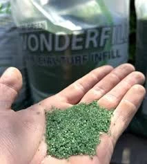This is a naturally round sand infill, green-coated with anti-microbial properties, used in artificial grass installs to neutralize bacteria.